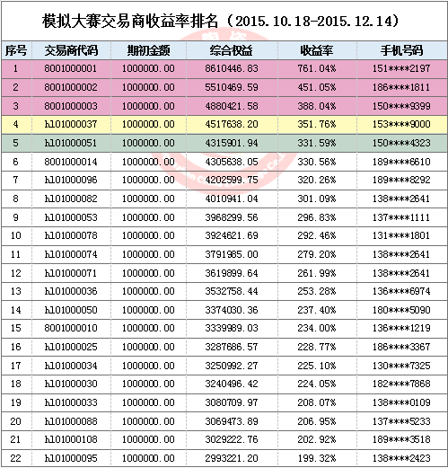 景德鎮(zhèn)陶瓷交易所首屆昌南杯模擬交易大賽10月18日火熱開賽以來,參賽人數(shù)持續(xù)攀升。通過近兩個月模擬交易大賽的鍛煉,參與模擬交易大賽的投資人會員對陶瓷藝術(shù)品投資的認(rèn)知度不斷提高,比賽也漸入佳境。截止12月14日收盤,模擬賬號"8001000001"以總收益率761.04%的成績拔得頭籌。"8001000002"以總收益451.05%的成績緊隨其后。"8001000003"以總收益388.04%成績位列第三。前二十選手的總收益也都在100%以上,值得慶賀。接下來的賽況如何,我們拭目以待!報名入口請點擊
