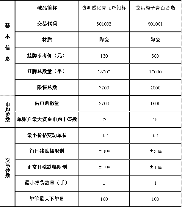 經景德鎮陶瓷交易所有限公司(以下稱本交易所)發行人會員申請,本交易所專家委員會、新藏品掛牌審核小組評估審核通過,對已經完成托管入庫的2只藏品《仿明成化青花雞缸杯》 、《龍泉梅子青百合瓶》準予在本交易所線上實物交易系統正式掛牌交易,具體事項公告如下: