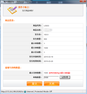 點擊‘配售’按鈕,填寫確認購買的數量,提交完成配售確認。如圖2.2.1-2
