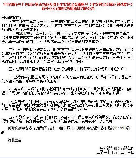 接平安銀行通知,自2017年5月25日起平安銀行系統(tǒng)將停止平安易寶賬戶的新開(kāi)立和現(xiàn)有平安易寶用戶的新簽約服務(wù)。具體情況如下: